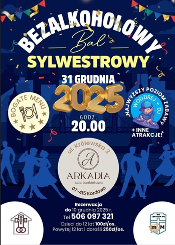 Serdecznie zapraszamy Was na kolejny już Bezalkoholowy Bal Sylwestrowy. Przybywajcie całymi rodzinami! W tym roku będziemy bawić się wspólnie w sali bankietowej „Arkadia” w Kordowie.