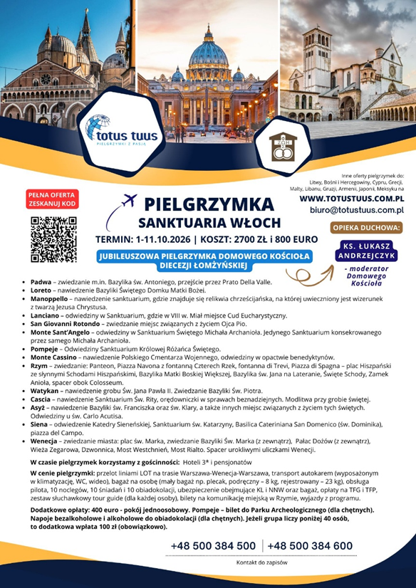 1-11.10.2026 – W ramach obchodów jubileuszu 100 – lecia naszej diecezji ⛪️ serdecznie zapraszamy do wspólnego pielgrzymowania 🛫🚎 Razem z całą diecezją będziemy uczestniczyli w audiencji z papieżem Leonem XIV 🙌
